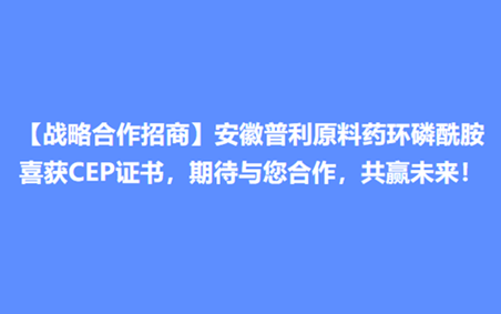【戰(zhàn)略合作招商】安徽普利原料藥環(huán)磷酰胺喜獲CEP證書,期待與您合作,共贏未來(lái)!