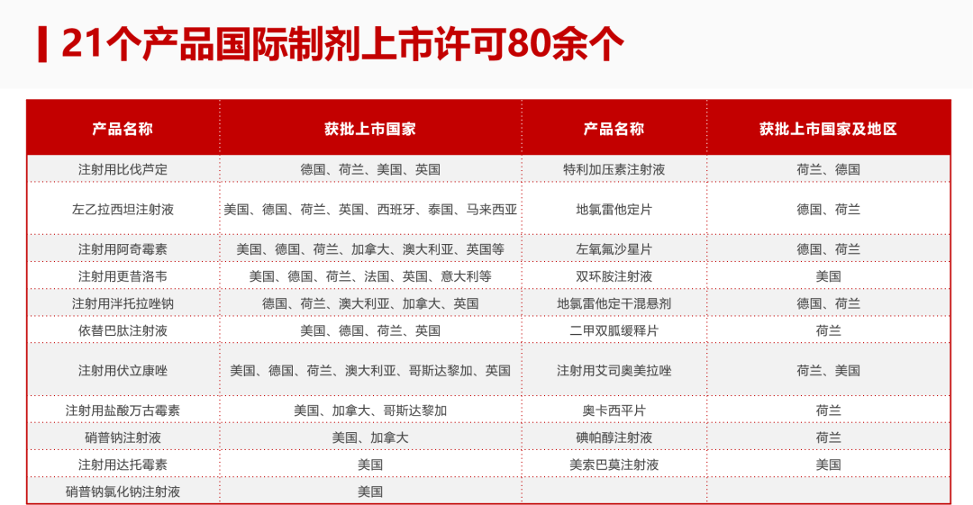 依托高標(biāo)準(zhǔn)質(zhì)量管理以及高品質(zhì)生產(chǎn)線,普利制藥已有16個(gè)針劑和5個(gè)口服共計(jì)21個(gè)產(chǎn)品先后獲得多個(gè)國(guó)家和地區(qū)的上市許可80余個(gè),其中13款產(chǎn)品還實(shí)現(xiàn)了在國(guó)外獲批上市的同時(shí),在國(guó)內(nèi)通過或者視同通過仿制藥一致性評(píng)價(jià)。