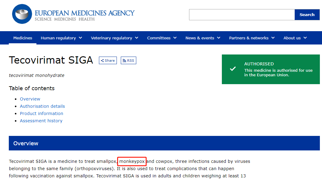 2022年,歐洲藥品管理局(EMA)基于動物和人類的研究數(shù)據(jù),批準(zhǔn)了tecovirimat用于猴痘的治療。