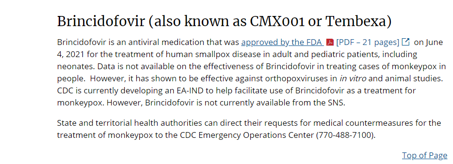 布林西多福韋適用于治療成人和兒童患者(包括新生兒)中由天花病毒引起的人類天花疾病。